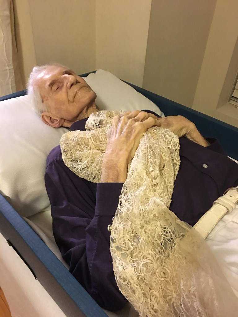 Using transfer methods we’d learned in our courses we struggled a bit to get a shower curtain under Eileen. There is a need for something to contain fluids as well as facilitate moving the body when the time comes.