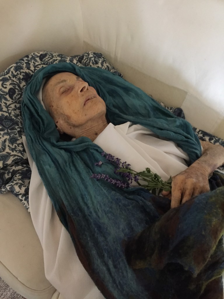 With Merissa’s guidance, we selected clothing for Eileen. By slitting the back of clothing it’s possible to dress the body with ease, tucking the back of the outfit under the body. We dressed her and shrouded her with a silk scarf. She looked beautiful.