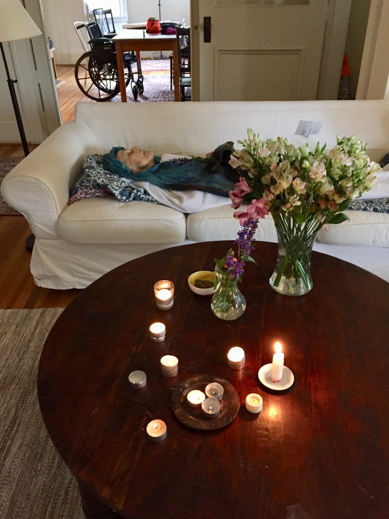 To keep a body at home for a day or two can be a lovely practice. Friends, relatives, and neighbors will come by, and many find it natural to sit in the room with the departed and chat and snack. This is what happened at Eileen’s death. People just started showing up and some brought food. Eileen lay there peacefully, as bouquets and candles appeared. People talked about her, exchanged stories, and ate finger food. Sometimes conversation drifted away from the subject of Eileen, and she was just “there”.